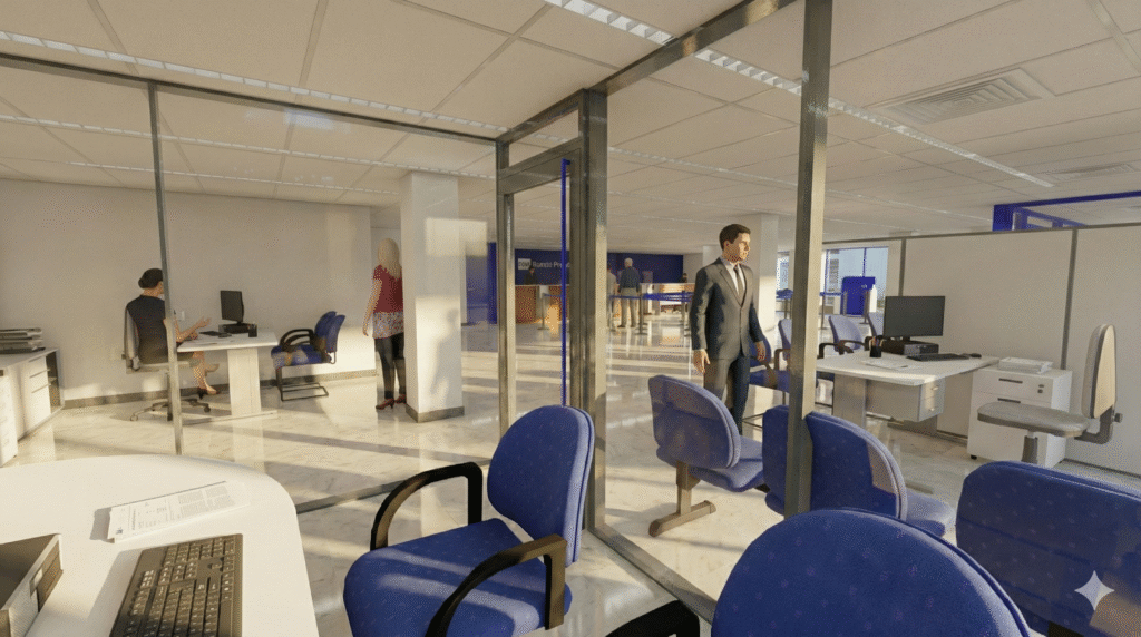 En un sector donde la seguridad y la experiencia del cliente son críticas, no basta con «decorar» un espacio. Ofrecemos una solución integral para entidades financieras que buscan expandirse o renovar su imagen.